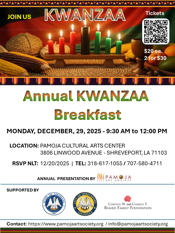 Pamoja Cultural Arts Center 3806 Linwood Ave, ShreveportCome celebrate with us for our Annual KWANZAA Breakfast on Monday, December 29, 2025 from 9:30AM-12:00PM CST. LOCATION: PAMOJA CULTURAL ARTS CENTER 3806 LINWOOD AVENUE - SHREVEPORT, LA 71103 RSVP NLT: 12/20/2025 | TEL: 318-617-1055 / 707-580-4711 - Pamoja Art Society Web Admin